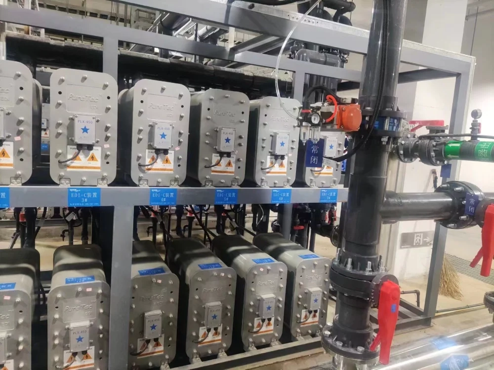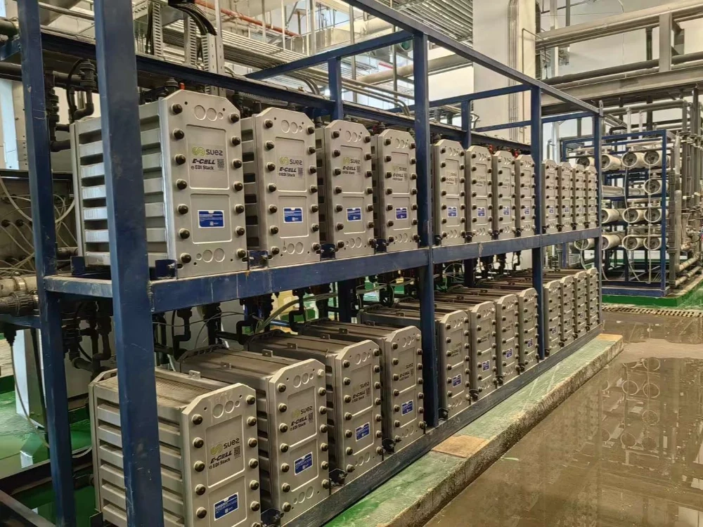 The resin inside the EDI device acts as an electrical conductor, and its own water dissociation effect (H2O → H+ + OH-) continuously regenerates the resin.