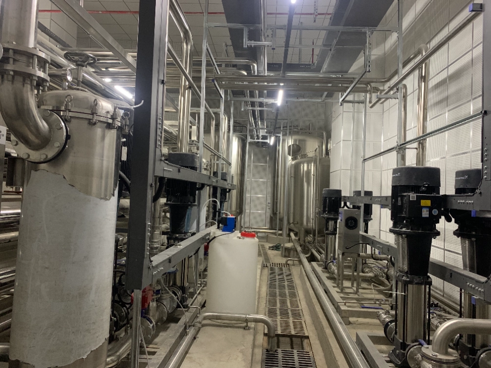 Le système utilise un processus à plusieurs étapes comprenant une vanne de stabilisation de la pression, un filtre à sable, un filtre à charbon, un adoucisseur, un filtre de sécurité, une OI à deux étapes et une désinfection par UV/O3. Il comprend également un filtre MF pour la stérilisation.
