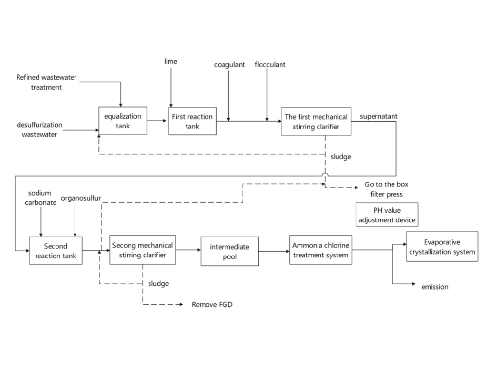 Coagulation chimique et clarification : Les eaux usées sont traitées dans le premier clarificateur à agitation mécanique, où des coagulants et des floculants sont ajoutés pour éliminer les solides en suspension. Les eaux usées sont traitées dans le premier clarificateur à agitation mécanique. surnageant puis procède à un traitement ultérieur.